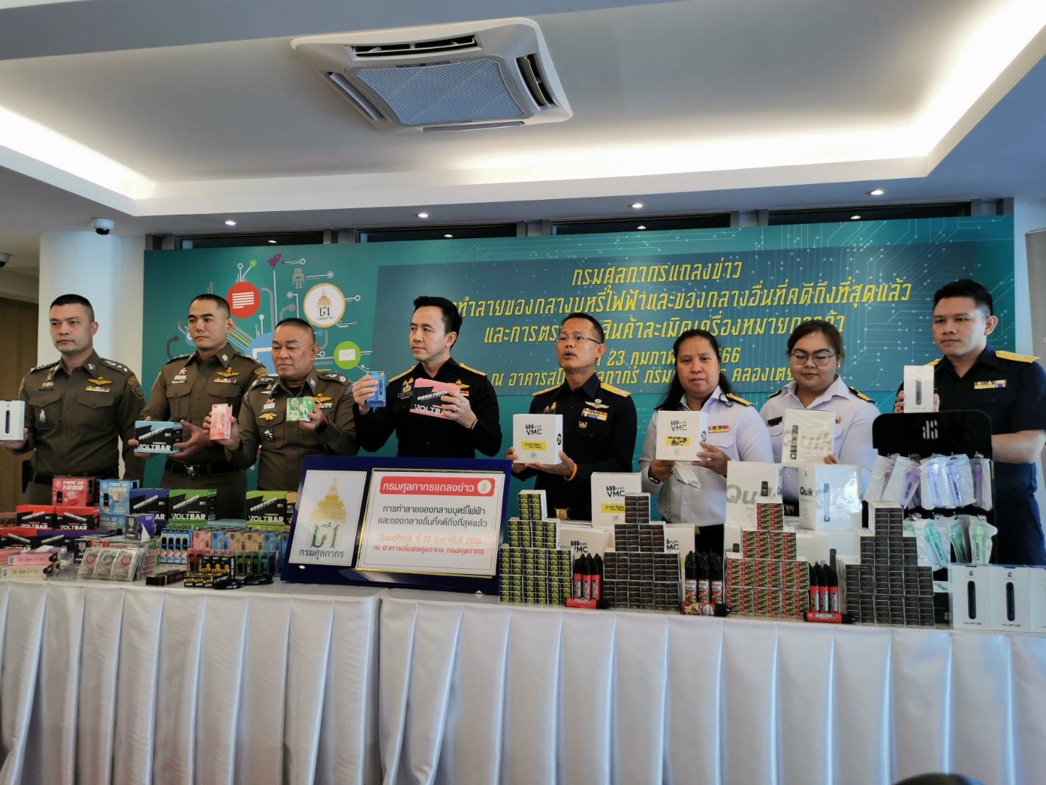 นายพันธ์ทอง ลอยกุลนันท์ รองอธิบดีกรมศุลกากร รักษาการในตำแหน่งที่ปรึกษาด้านการพัฒนาและบริหารการจัดเก็บภาษี ในฐานะโฆษกกรมศุลกากร เปิดเผยว่า กรมศุลกากรทำงานร่วมกับกองบังคับการปราบปรามการกระทำความผิดเกี่ยวกับอาชญากรรมทางเศรษฐกิจ และกองบัญชาการตำรวจสืบสวนสอบสวนอาชญากรรมทางเทคโนโลยี ได้จับกุมและตรวจยึดสินค้า ได้แก่ เครื่องบุหรี่ไฟฟ้า น้ำยาบุหรี่ไฟฟ้า หัวบุหรี่ไฟฟ้าที่ใช้สำหรับดูดและอุปกรณ์อื่น ที่มีการลักลอบนำเข้ามาในราชอาณาจักรไทยมาโดยตลอด และมีการดำเนินคดีจนถึงที่สุด ซึ่งของกลางดังกล่าวตกเป็นของแผ่นดิน สำหรับการทำลายของกลาง ในครั้งนี้ ประกอบด้วย เครื่องบุหรี่ไฟฟ้า น้ำยาบุหรี่ไฟฟ้า หัวบุหรี่ไฟฟ้าที่ใช้สำหรับดูดและอุปกรณ์อื่น ๆ รวมทั้งสิ้นเป็นจำนวน 874,535 ชิ้น คิดเป็นมูลค่าราคารวมค่ภาษีอากรทั้งหมด 72,019,523.46 บาท ทั้งนี้ บุหรี่ไฟฟ้า ซึ่งเป็นสิ่งของต้องห้ามนำเข้ามาในราชอาณาจักร เจ้าของหรือผู้ครอบครองมีความผิดตามกฎหมายศุลกากรในการช่วยซ่อนเร้น ช่วยจำหน่าย ช่วยพาเอาไปเสีย ซื้อ จำนำ หรือรับไว้โดยประการใด ซึ่งสิ่งของอันตนรู้ว่าเป็นของที่ยังมิได้ผ่านพิธีการศุลกากร หรือเคลื่อนย้ายของออกไปจากยานพาหนะ คลังสินค้าทัณฑ์บน โรงพักสินค้า ที่มั่นคง ท่าเรือรับอนุญาต หรือเขตปลอดอากร โดยไม่ได้รับอนุญาตจากพนักงานศุลกากร”