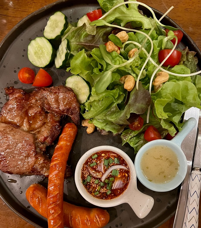 เมนูอาหารเพื่อสุขภาพของผมในวันนี้ขอแนะนำ สเต็กสันคอหมูแจ่วแซบ ขอบอกเลยว่าเมนูนี้ถูกใจหนุ่ม-สุทนครับ นอกจากนี้ทางร้านยังมีอีกหลายหลายเมนูให้เลือก เช่น สลัดผักสดๆ สลัดผักสดปลาแซลมอน สลักกุ้งทอดและอีกหลายหลายเมนู หรือจะสั่งไอศกรีมผักโขมไม่ขม ซิกเนเจอร์เท่านั้น ต้องไปลองกันเองครับ