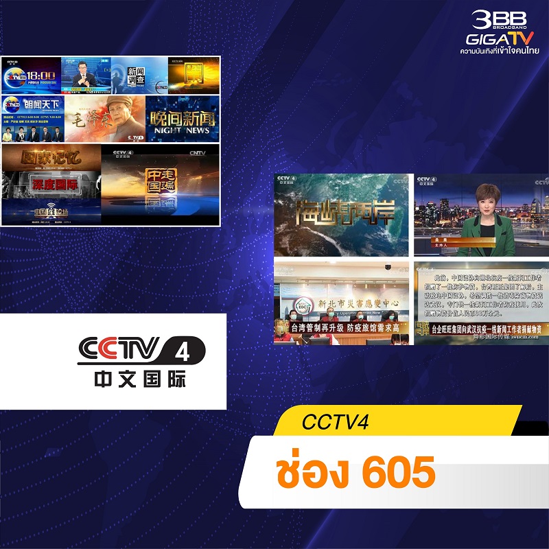 และสถานีโทรทัศน์ภาคภาษาจีนกลาง ออกอากาศทั่วโลก CCTV4 ช่อง 605 มีบริษัทซีทีวีโกลเด้น บริดจ์ อินเตอร์แนชั่นแนล มีเดีย เป็นผู้ผลิตเนื้อหาให้สถานี เป็นหนึ่งในห้าช่องรายการระดับนานาชาติของ CCTV นอกเหนือจากการออกอากาศในประเทศจีนเพื่อขยายผู้ชมไปทั่วโลก ช่องรายการนี้ประกอบไปด้วย สารคดี, ละคร, เพลง, กีฬา และ การ์ตูน