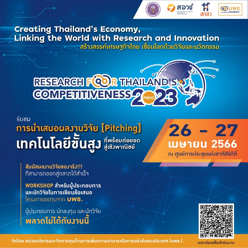 ขอเชิญชวน กลุ่มนักวิจัย นักธุรกิจ และบุคคลทั่วไป เข้าชมงาน PMUC Research for Thailand’s Competitiveness 2023 การนำเสนอผลงานวิจัย Pitching เทคโนโลยีขั้นสูงที่พร้อมต่อยอดเชิงพาณิชย์ ระหว่างวันที่ 26-27 เมษายน นี้ ณ ศูนย์ประชุมแห่งชาติสิริกิติ์