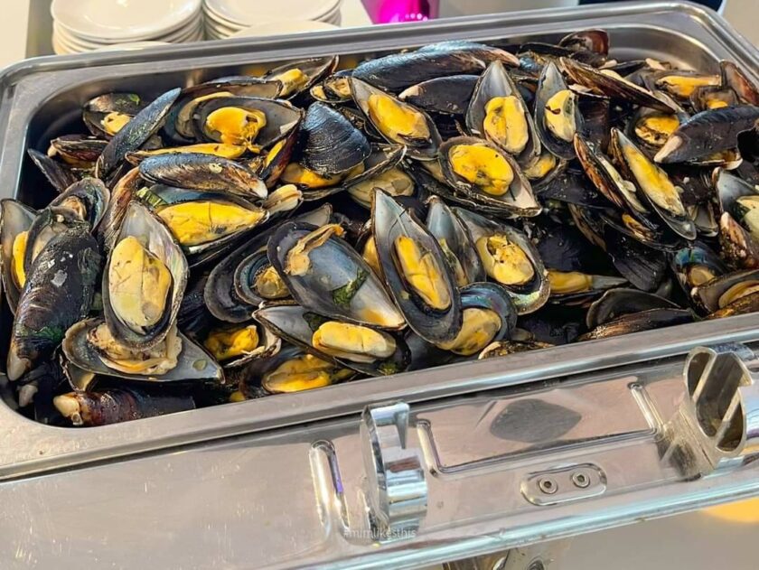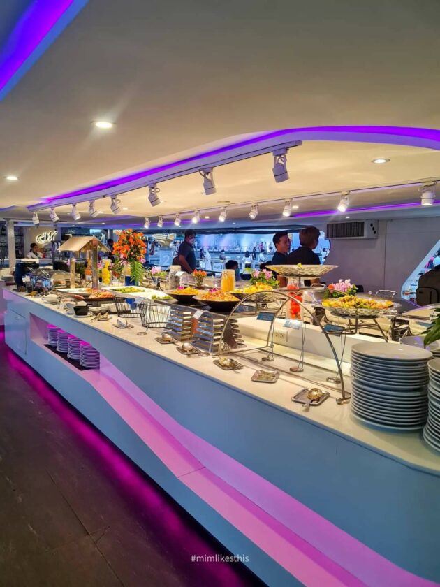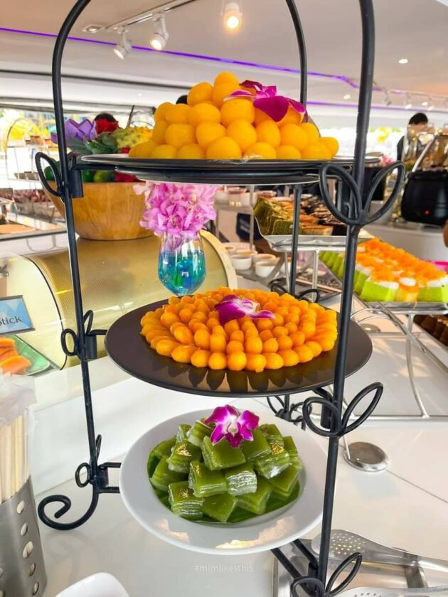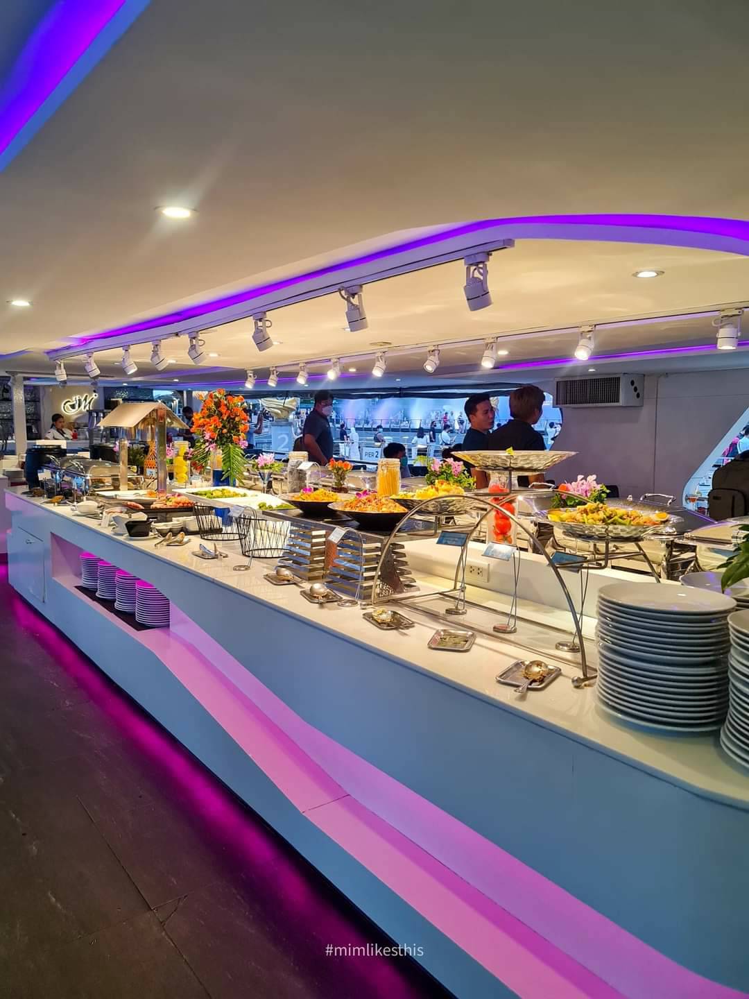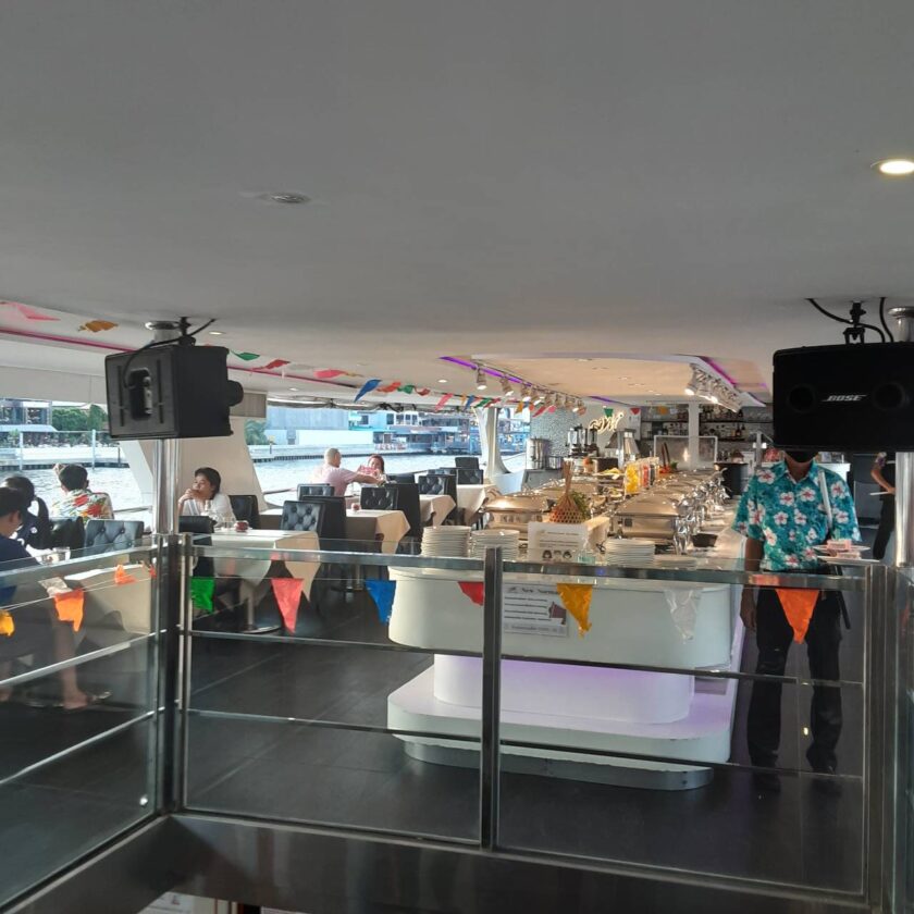 - บนเรือ Meridian Cruise มีบุฟเฟ่ต์อาหารนานาชาติ ทั้งอาหารฝรั่ง อาหารญี่ปุ่น และอาหารไทย ให้เลือกรับประทานมากมาย ไม่ว่าจะเป็นซีฟู้ดที่มีกุ้งเผาและหอยแมลงภู่ตัวโตๆ อาหารไทยหลากเมนู เช่น ต้มยำกุ้ง ผัดไทย ไก่ผัดเม็ดมะม่วงหิมพานต์ ฯลฯ รวมทั้งเมนูเด็ดที่คนพูดถึงกันมากนั่นคือ ก๋วยเตี๋ยวเรือน้ำตก หรืออาหารญี่ปุ่นเมนูยอดฮิตอย่างซูชิหน้าต่างๆ ก็มีนะ ตบท้ายด้วยเมนูขนมหวานทั้งไทยและเทศ พร้อมด้วยผลไม้นานาชนิด ทานอาหารไป ดื่มเครื่องดื่มไป พร้อมทั้งฟังดนตรีสดจาก Live Band คลอไปด้วย แค่นี้ก็อิ่มกายอิ่มใจและประทับใจกับการบริการของเรือเมอริเดียน ครูซ