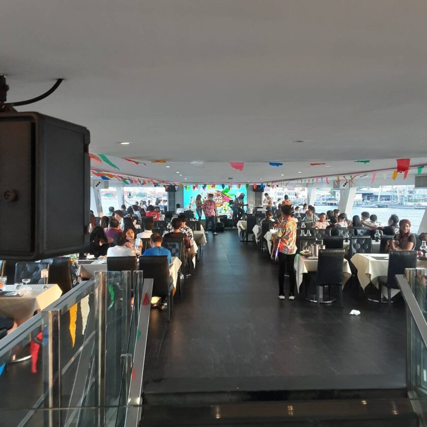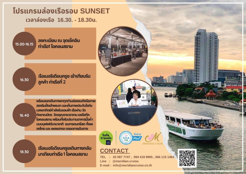 - Meridian Cruise แนะนำสำหรับท่านที่ไม่อยากกลับดึกรอบนี้เลย รอบพระอาทิตย์ตกดินและ เปิดรอบเพิ่มเพื่อร่วมฉลองเทศกาลสงกรานต์ 13-16 เมษายน 2566 พาคนรัก พาครอบครัวมานั่งชิลล่องเรือชมพระอาทิตย์ตกดินในวันสงกรานต์ แถมยังมีเวลาช็อปที่ไอคอนสยามต่อหลังจากลงเรืออีกด้วย