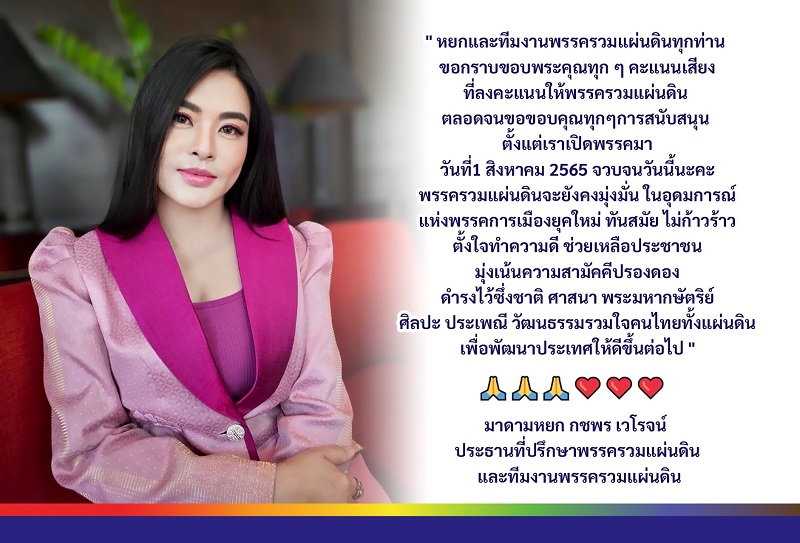 “มาดามหยก” ประธานที่ปรึกษาพรรครวมแผ่นดินและ หัวหน้าสาขาภาคเหนือ ประธานโครงการ “Change Together เปลี่ยน…ไปด้วยกัน” ที่ปรึกษากิตติมศักดิ์มูลนิธิเอ็มพลัส ที่ปรึกษากิตติมศักดิ์กองประกวดนางสาวเชียงใหม่ในดวงใจ ประธานที่ปรึกษากิตติมศักดิ์ Miss Universe Chiang Mai 2023 ขอกราบขอบพระคุณทุกคะแนนเสียง มอบให้ “พรรครวมแผ่นดิน” ยืนยันจะทำงานเพื่อประชาชนและประเทศชาติต่อไป