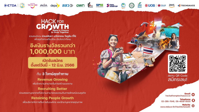 19 พฤษภาคม 2566, กรุงเทพฯ – สำนักงานพัฒนาธุรกรรมทางอิเล็กทรอนิกส์ (สพธอ.) หรือ ETDA (เอ็ตด้า) จับมือพาร์ทเนอร์รัฐ-เอกชนกว่า 15 หน่วยงาน อาทิ กรมการท่องเที่ยว การท่องเที่ยวแห่งประเทศไทย (ททท.) สำนักงานนวัตกรรมแห่งชาติ (NIA) สำนักงานส่งเสริมเศรษฐกิจดิจิทัล (depa) สำนักงานส่งเสริมวิสาหกิจขนาดกลางและขนาดย่อม (สสว.) และ เทคซอส มีเดีย เร่งดันธุรกิจท่องเที่ยวไทย จัดใหญ่ “Hack for GROWTH” ในคอนเซ็ปต์ Make a Chance to Grow Together เฟ้นหานวัตกรรมที่ “ใช่” ตอบโจทย์ธุรกิจท่องเที่ยวไทยเพื่อยกระดับการเติบโต สู่การเพิ่มขีดความสามารถในการแข่งขันทางดิจิทัลไทยในอนาคต ชิงเงินรางวัลรวมกว่า 1 ล้านบาท รับสมัครแล้ววันนี้