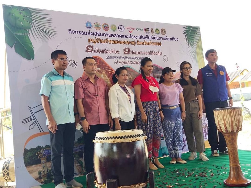 การเปิดงาน “กิจกรรมเปิดเส้นทางนำร่องท่องเที่ยว Fam Trip เส้นทางหมู่บ้านทำกลองเอกราช” ภายใต้โครงการส่งเสริมการท่องเที่ยวเชิงสร้างสรรค์ 1 เมืองท่องเที่ยว 1 ประสบการณ์ท้องถิ่น จังหวัดอ่างทอง ประจำปีงบประมาณ พ.ศ. ๒๕๖๖ โดยมีวัตถุประสงค์ เพื่อส่งเสริมและพัฒนาพื้นที่ที่มีศักยภาพด้านการท่องเที่ยวของจังหวัดอ่างทองในการนำ Soft Power “กลองเอกราช” ที่ถือได้ว่าเป็นอัตลักษณ์ที่โดดเด่น และได้รับการขึ้นทะเบียนสิ่งบ่งชี้ทางภูมิศาสตร์ไทย (GI) ของจังหวัดอ่างทองมานำเสนอให้นักท่องเที่ยวได้เป็นที่รู้จักเพิ่มมากขึ้น และเชิญชวนนักท่องเที่ยวสัมผัสประสบการณ์ท้องถิ่น (One Destination, One Local Experience) ของจังหวัดอ่างทอง ที่มีเส้นทางทางประวัติศาสตร์ วัฒนธรรม และภูมิปัญญาท้องถิ่น