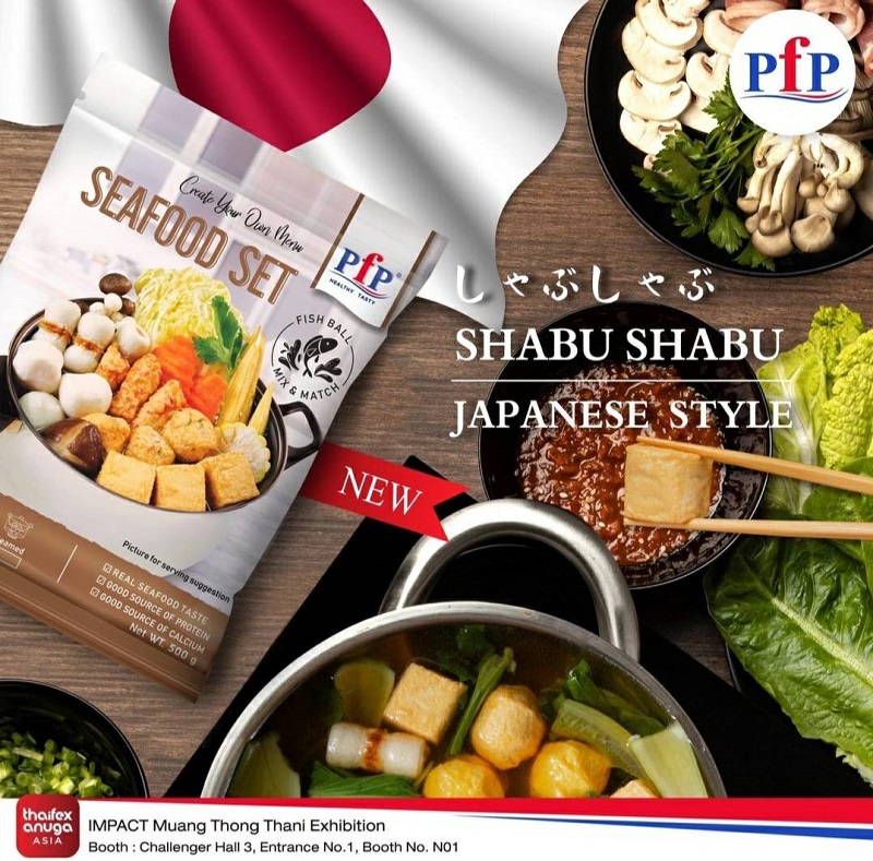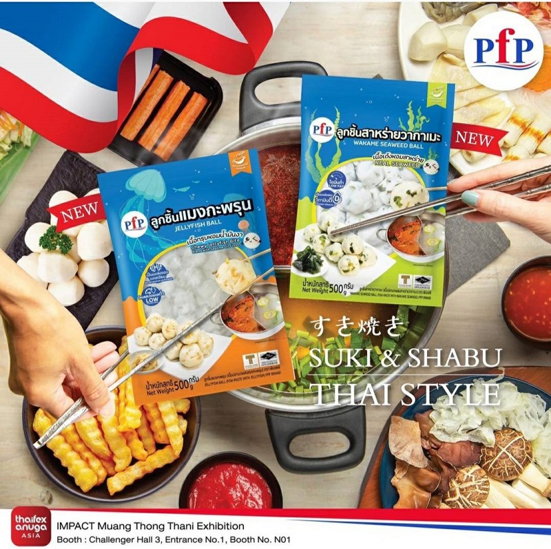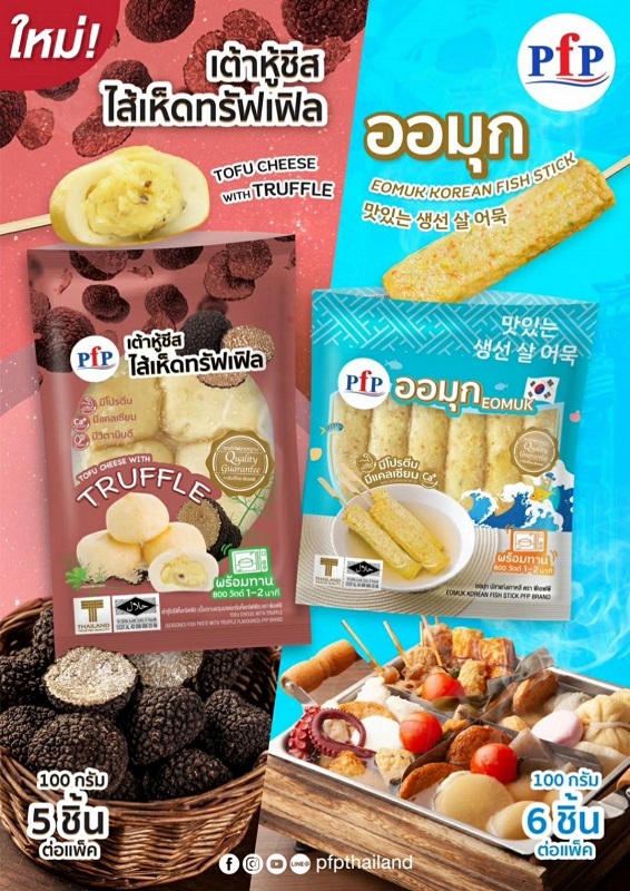 ภายในงานนี้ PFP ยังมีผลิตภัณฑ์ใหม่มาแนะนำเพื่อเติมเต็มความอร่อยในการรับประทานชาบู เอาใจแฟนพันธ์ุแท้สายชาบูแบบสุดๆ ด้วยผลิตภัณฑ์ลูกชิ้นสาหร่ายวากาเมะ ขนาด 500 กรัม เนื้อเด้ง หอมสาหร่ายวากาเมะ และผลิตภัณฑ์ลูกชิ้นแมงกะพรุน ขนาด 500 กรัม เนื้อกรุบ หอมน้ำมันงา พร้อมโปรโมชั่นพิเศษเฉพาะงานนี้เท่านั้น สามารถสั่งซื้อเติมเต็มความอร่อยได้แล้ววันนี้ที่ PFP SHOP ทุกสาขา , Facebook : pfpthailand , Line My shop (Line shopping), Grab , Robinhood และ PFP ยังมีอีก 2 คู่หู ผลิตภัณฑ์น้องใหม่ไซส์มินิ เตรียมบุกตลาดร้านสะดวกซื้อ มาแนะนำในงานนี้อีกด้วย โดยเพิ่มออฟชั่นความอร่อยแปลกใหม่ของเต้าหู้ชีสด้วยผลิตภัณฑ์เต้าหู้ชีสไส้เห็ดทรัฟเฟิล ขนาด 100 กรัม และผลิตภัณฑ์ปลาแท่งเกาหลี ออมุก ขนาด 100 กรัม เน้นชู ‘อร่อยตามเทรนด์ ได้คุณค่า สะดวก ปลอดภัย เข้าถึงง่าย’ พร้อมจำหน่ายแล้ววันนี้ที่ lotus go fresh ทุกสาขาในกรุงเทพและปริมณฑล