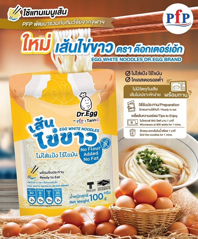 นอกจากนั้นในปีนี้ PFP ยังได้จับมือกับ บริษัท ทานดี อินโนฟูด จำกัด ร่วมพัฒนา ผลิตภัณฑ์โปรตีนทางเลือกใหม่ใส่ใจสุขภาพโดยมีทีมงานที่เป็นผู้เชี่ยวชาญจากภาควิชาโภชนาการและกำหนดอาหารคณะสหเวชศาสตร์ จุฬาลงกรณ์มหาวิทยาลัย ร่วมพัฒนาผลิตภัณฑ์ เส้นโปรตีนจากไข่ขาว ขนาด 100 กรัม ภายใต้แบรนด์ “Dr.Egg” โดยใช้นวัตกรรมรองรับเทรนด์อาหารแห่งอนาคต “Protein Transformation Technology” นำสารสกัดจากพืชมาใช้หุ้มตัวไข่ขาวแล้วรีดออกมาเป็นเส้น เปลี่ยนรูปจากไข่ขาวต้มธรรมดาให้กลายเป็นเส้นไข่ขาวพร้อมทานโดยไม่ใส่แป้ง ไร้ไขมัน ทำเมนูอาหารได้หลากหลาย เส้น นุ่ม เด้ง ให้รสสัมผัสในการรับประทานใกล้เคียงเส้นที่ทำจากแป้ง เป็นผลิตภัณฑ์ที่มีคุณค่าทางโภชนาการที่ดีกว่า ไม่มีคลอเรสตอรอล ได้โปรตีนจากไข่ขาว พลังงานต่ำ และเต็มไปด้วยสารอาหารจำเป็นอื่นๆอย่างไฟเบอร์ กรดอะมิโนและแคลเซียม ปราศจากวัตถุกันเสีย เหมาะสำหรับผู้ป่วยที่ต้องการควบคุมระดับไขมันและคลอเลสเตอรอล กลุ่มผู้บริโภคที่ต้องการดูแลสุขภาพควบคุมน้ำหนักจึงมองไข่ขาวเป็นองค์ประกอบที่สำคัญในการทำเมนูอาหารเพื่อบริโภค สนใจสามารถสั่งซื้อได้ที่ PFP SHOP ทุกสาขา , Facebook : pfpthailand , Line My shop (Line shopping)สั่งผ่าน Grab , Robinhood อีกทั้ง PFP ยังมีความร่วมมือกับสถาบันชั้นนำ ในการพัฒนาสินค้ากลุ่มทดแทนเนื้อสัตว์และผลไม้แช่เยือกแข็งซึ่งเป็นเทรนด์อาหารเพื่อสุขภาพที่ช่วยลดสภาวะโลกร้อนและส่งเสริมเกษตรกรไทยให้เข้มแข็งและยั่งยืน