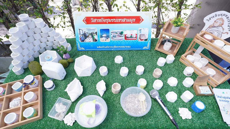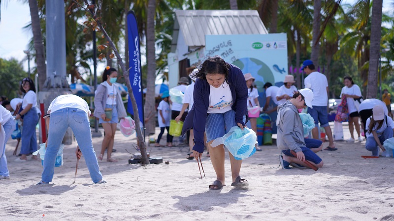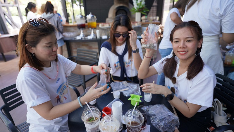 พนักงานจิตอาสาและผู้ติดตาม ได้แบ่งกลุ่มเพื่อทำกิจกรรมเก็บขยะตลอดชายหาดบางแสนตอนล่าง เป็นเวลากว่า 2 ชั่วโมง จากนั้น ทุกคนได้ร่วมกิจกรรมกับชาวชุมชนเขาสามมุข ทำกระถางต้นไม้จากเปลือกหอยนางรม ซึ่งเป็นผลิตภัณฑ์จากวิสาหกิจชุมชนเขาสามมุข โดยมีพี่น้องในชุมชนช่วยสอนการทำทุกขั้นตอน กระทั่งทุกคนได้ชื่นชมผลงานกระถางประดิษฐ์ของตนเอง ก่อนจะใช้ P-Touch เครื่องยิงลาเบลพิมพ์ข้อความ แล้วติดบนกระถางปูนอย่างเรียบร้อยสวยงาม เป็นอันเสร็จสิ้นกิจกรรม