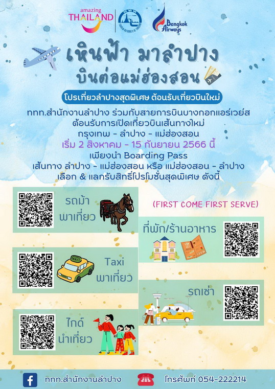 สอบถามเพิ่มเติม ททท.สำนักงานลำปาง 054-222214 หรือเพจเฟซบุ๊ก ททท.สำนักงานลำปาง
