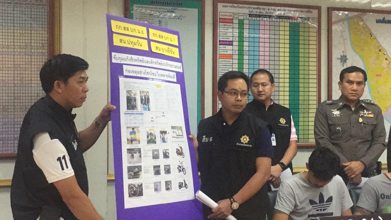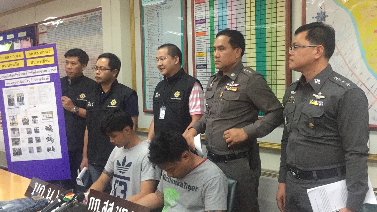 สน.บางยี่ขัน รวบแก๊งลักรถจยย.ย่านฝั่งธน วันอาทิตย์ ที่ 14 ก.พ.59 เวลา 14.00 น. พ.ต.อ.กมล สุทธิแพทย์ รอง ผบก.น. 7 พร้อมด้วย พ.ต.อ.นพสิทธิ์ มิตรภักดี ผกก.สส.บก.น.6 พ.ต.อ.ธนพล บินทปัญญา พงส.ผทค.สน.บางยี่ขัน พ.ต.ต.ชนทัช วุฒิภัทรโสภณ สว.สส.บก.น.6 และเจ้าหน้าที่ฝ่ายสืบสวน บก.น.6 ร่วมกันแถลงจับกุม 2 ผู้ต้องหา “แก๊งโคนอน” ประกอบด้วย นายเมธาวัฒน์ หรือแอ๊ด สายแขก อายุ 26 ปี และนายเฉลิมวุฒิ หรือจ็อบ แสงทรัพย์ อายุ 21 ปี ในข้อหา ร่วมกันชิงทรัพย์โดยมีอาวุธและยานพาหนะเพื่อกระทำผิดหรือพาทรัพย์นั้นไปหรือให้พ้นจากการจับกุมและเป็นเหตุให้ผู้อื่นได้รับอัตรายแก่กายหรือจิตใจ,ร่วมกันมีอาวุธปืนและเครื่องกระสุนปืนไว้ในครอบครองโดยไม่ได้รับอนุญาต,พาอาวุธปืนติดตัว ยิงปืนในที่สาธารณะโดยไม่มีเหตุอันควรและร่วมกันพยามฆ่าผู้อื่นโดยเจตนา พร้อมของกลางเสื้อผ้าที่ใช้ก่อเหตุ โดยสามารถจับกุมผู้ต้องหาทั้ง 2 รายได้บริเวณบ้านเลขที่ 96 หมู่ 1 บ้านวัดเหนือ ต.พนมไพร อ.พนมไพร จ.ร้อยเอ็ด เมื่อวันที่ 12 ก.พ.ที่ผ่านมา