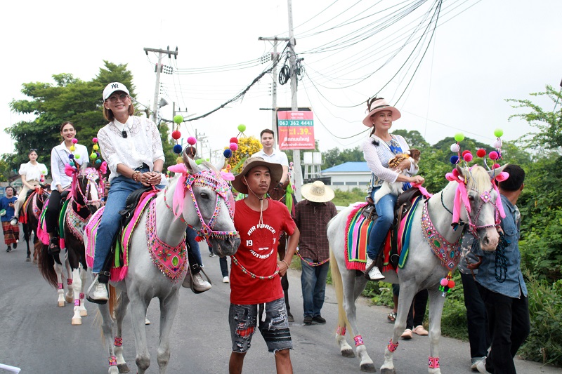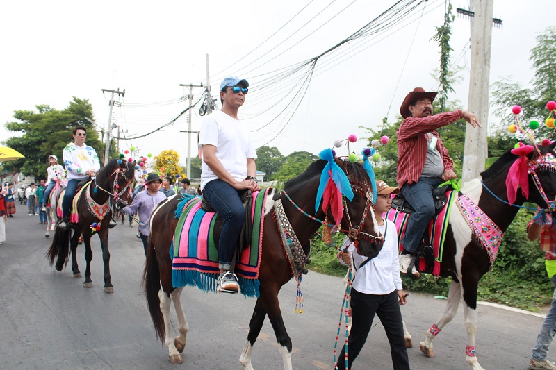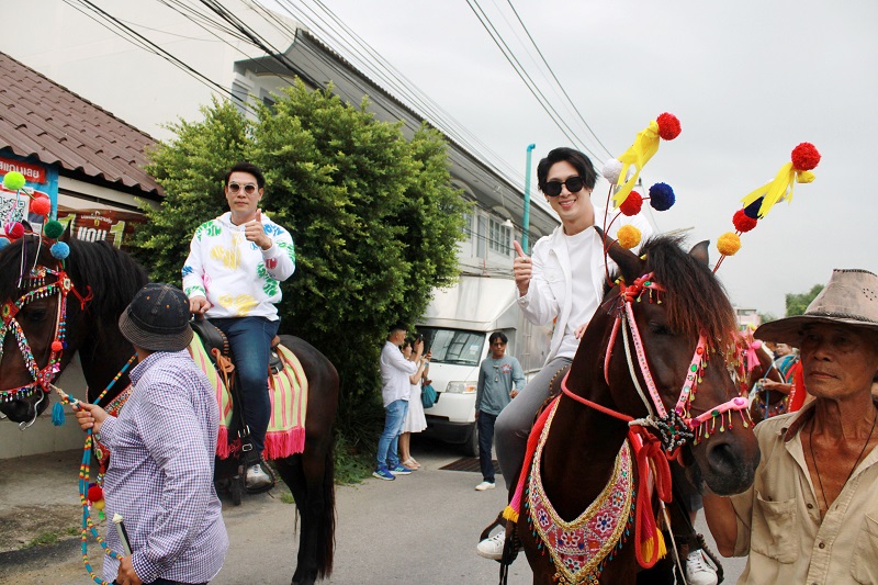บรรยากาศในช่วงเช้าได้มีการจัดขบวน ม้า ควาย วัวเทียมเกวียน ที่ถูกตกแต่งอย่างสวยงามตระการตา โดยมีกลุ่มชาวบ้านแต่งตัวเป็นเจ้าเงาะเดินนำขบวน อีกหนึ่งสีสันภายในงานนี้คือเหล่าศิลปินนักแสดงที่ได้ขึ้นนั่งบนหลังม้า และร่วมขบวนแห่ไปตามถนนสายหลัก เลียบแม่น้ำแม่กลอง มุ่งหน้าเข้าสู่ตัวเมืองอำเภอบ้านโป่ง แม้สายฝนจะเทกระหน่ำลงมา แต่บรรยากาศก็เป็นไปอย่างอบอุ่น โดยมีประชาชนให้ความสนใจออกมายืนรอชมกันริมสองข้างทาง นอกจากนี้ทีมนักแสดงยังได้แวะเวียนไปทักทายเหล่าพ่อค้าแม่ขายผู้ใจบุญ ในตลาดเก่าโคยกี๊ ตลาดริมนํ้าแม่น้ำแม่กลอง ที่ต่างออกมาร่วมทำบุญกับเหล่านักแสดงกันอย่างคึกคัก