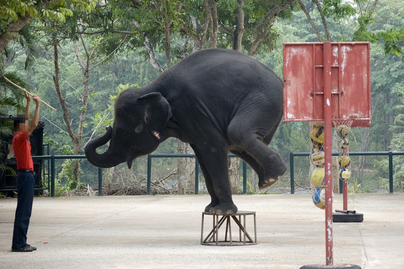 ข้อมูลจากองค์กรพิทักษ์สัตว์แห่งโลกระบุ ปัจจุบันในประเทศไทย มีช้างกว่า 4,000 ตัว ในอุตสาหกรรมท่องเที่ยว ผ่านกิจรรมโชว์ช้าง ขี่ช้าง เดินสองขา วาดรูป ขี่จักรยาน หรือแสดงพฤติกรรมผิดธรรมชาติอื่นๆ ซึ่งส่วนใหญ่มีเบื้องหลังที่เลวร้าย ตั้งแต่การพรากลูกช้างมาจากแม่ตั้งแต่ยังเล็ก นำมาฝึกตั้งแต่ยังเด็ก ทำให้เชื่อง เชื่อฟังคำสั่ง ซึ่งต้องใช้วิธีที่รุนแรง ช้างจะถูกกักขัง บังคับ ถูกใช้งานอย่างหนัก ถูกขอสับ ถูกล่ามโช่ ไม่มีโอกาสได้ใช้ชีวิตตามธรรมชาติในแบบที่ควรจะเป็น ทำให้ช้างบาดเจ็บทั้งร่างกายและจิตใจ ทุกข์ทรมานตั้งแต่เกิดจนตาย