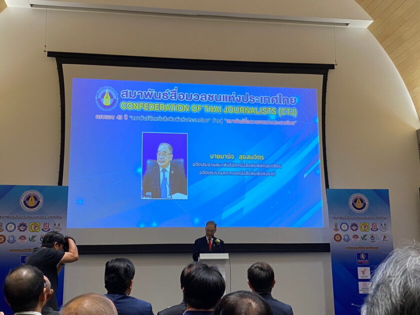 เมื่อวันที่ 21 กันยายน 2566 ที่ THE MITR – TING ROOM ชั้น 5 ศูนย์การค้าสามย่านมิตรทาวน์ สมาพันธ์นักหนังสือพิมพ์แห่งประเทศไทย ได้จัดงานประกาศเปลี่ยนชื่อองค์กรและตราสัญลักษณ์เป็น “สมาพันธ์สื่อมวลชนแห่งประเทศไทย” เพื่อความเหมาะสมกับบริบทและภูมิทัศน์ของสื่อมวลชนยุคใหม่ โดยมี ดร.สุวัฒน์ ทองธนากุล ประธานคณะทำงานยุทธศาสตร์สมาพันธ์ฯ คุณวันฉัตร สุวรรณกิตติ รองเลขาธิการ สภาพัฒนการเศรษฐกิจและสังคมแห่งชาติ คุณธันญพร กริชติทายาวุธ ผู้อำนวยการสมาคมเครือข่ายโกลบอลคอมแพ็กแห่งประเทศไทย (GCNT) ผศ.ชล บุนนาค ผู้อำนวยการโครงการ SDG Move คณะเศรษฐศาสตร์ มหาวิทยาลัยธรรมศาสตร์ และ ดร.สุวัฒน์ ทองธนากุล ที่ปรึกษาสมาพันธ์ฯ และอดีตประธานสมาพันธ์ฯ เป็นพิธีกรดำเนินรายการ