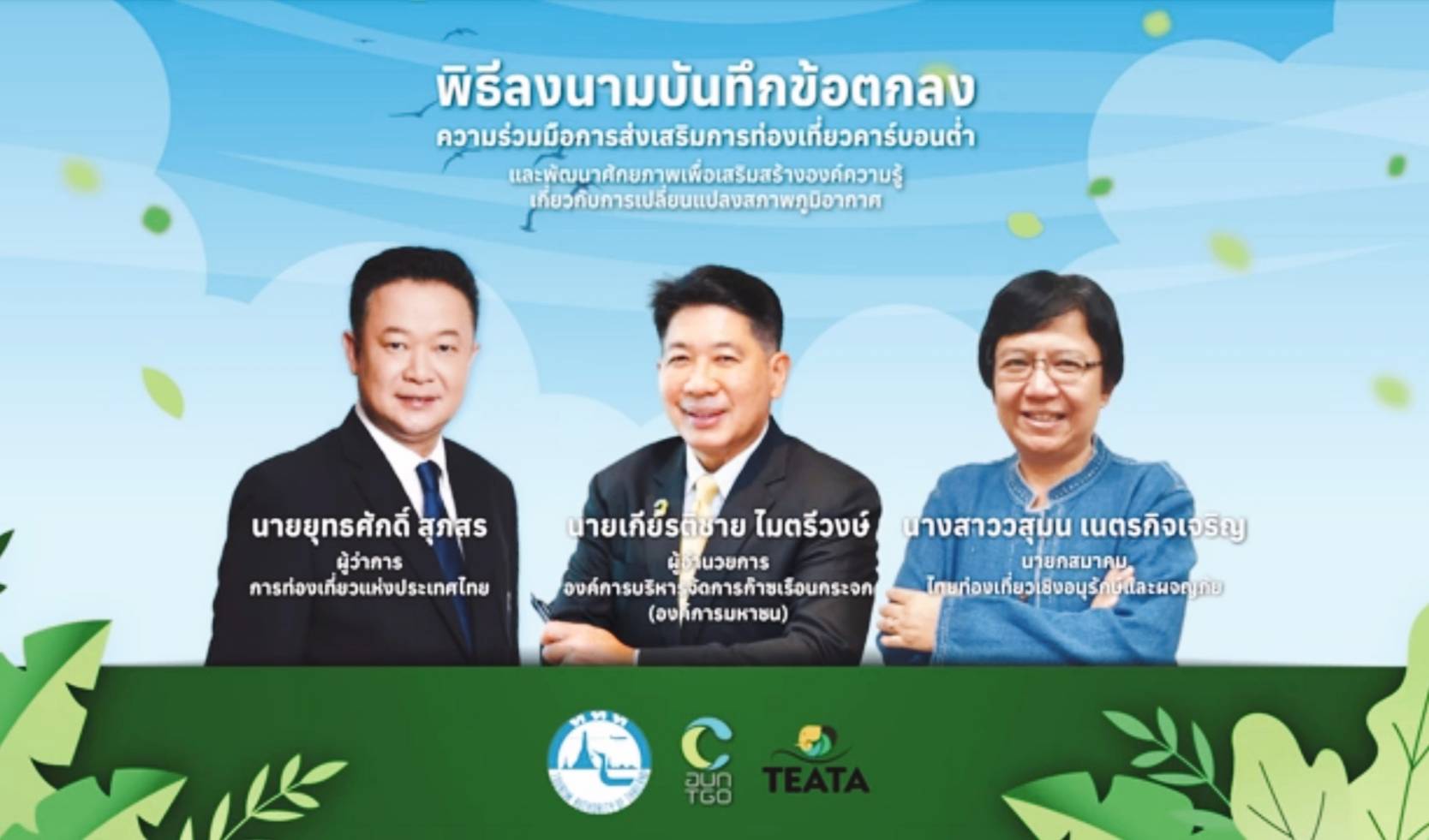 ททท. จับมือ อบก. และ สทอ. ลงนามบันทึกข้อตกลงความร่วมมือ (MOU) ส่งเสริมการท่องเที่ยวคาร์บอนต่ำ    และการพัฒนาศักยภาพเสริมสร้างองค์ความรู้เกี่ยวกับการเปลี่ยนแปลงสภาพภูมิอากาศสู่การท่องเที่ยวยั่งยืน