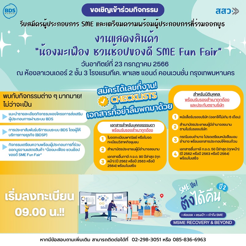 สสว. รับสมัครผู้ประกอบการร่วม “SME ปังตังได้คืน ก้าวสู่ปี ที่ 2 ” เตรียมจัด “น้องมะเฟือง ชวนช้อปของดี SME Fun Fair” ณ โรงแรม ทีเค. พาเลซ แอนด์ คอนเวนชั่น 23 ก.ค. 66