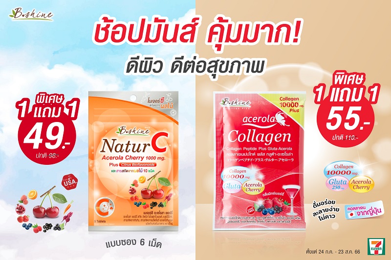 “บีไชน์” จัด 2 โปร วิตามินซีและคอลลาเจน ยิ่งทานคู่กัน ดีต่อผิวและสุขภาพ ซื้อ 1 แถม 1 ช้อปมันส์ คุ้มมาก! ตั้งแต่วันนี้ – 23 สิงหาคม ที่เซเว่น อีเลฟเว่น