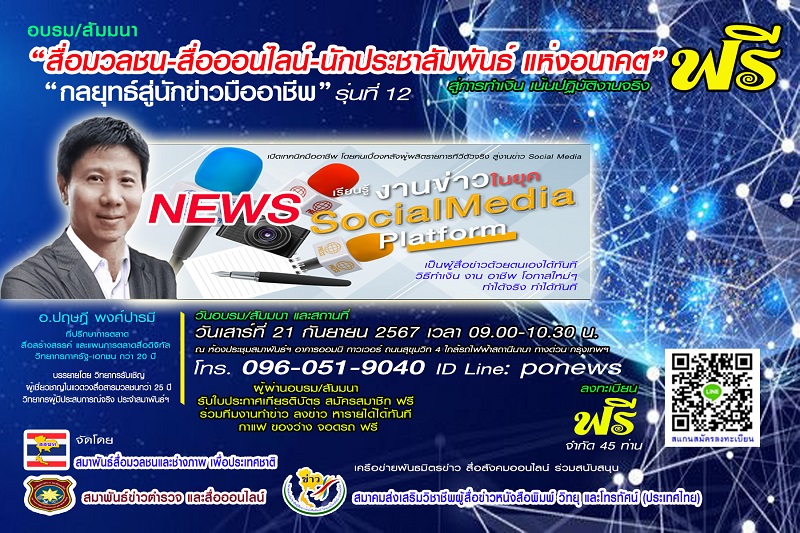 อบรม/สัมมนา นักข่าวมืออาชีพ 3 คอร์ส 1.สื่อมวลชน-สื่อออนไลน์-นักประชาสัมพันธ์ แห่งอนาคต “กล…