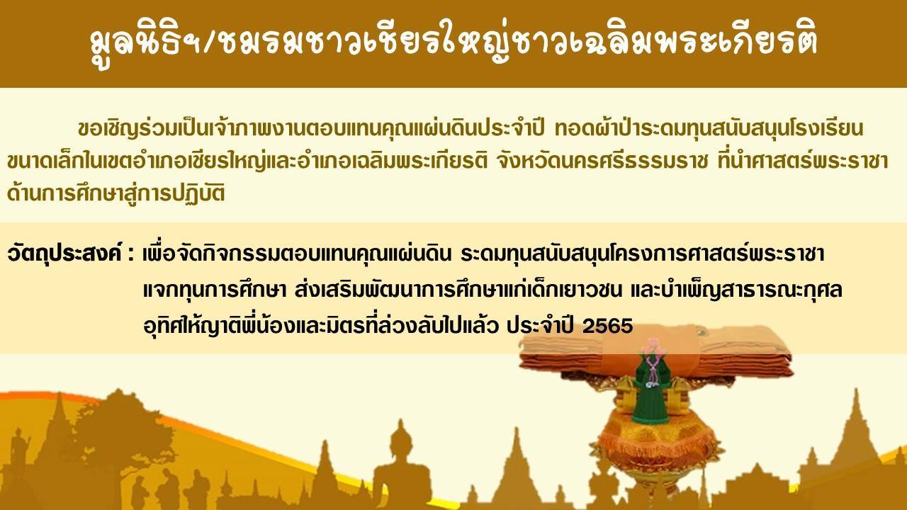 มูลนิธิชมรมชาวเชียรใหญ่เฉลิมพระเกียรติ จัดทอดผ้าป่าระดมทุนสนับสนุนโรงเรียนขนาดเล็กในเขตอำเภอเชียงใหญ่และอำเภอเฉลิมพระเกียรติจังหวัดนครศรีธรรมราช