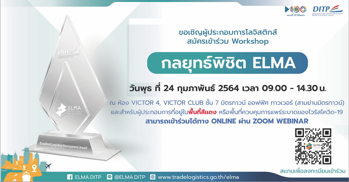 DITP ขอเชิญผู้ประกอบการโลจิสติกส์ไทย ร่วมกิจกรรม Workshop “กลยุทธ์พิชิตรางวัล ELMA” 18/02/202118/02/2021 กอง บก. เมื่อวันที่ 16 กุมภาพันธ์ 2564 ที่ผ่านมา กรมส่งเสริมการค้าระหว่างประเทศ (DITP) กระทรวงพา… Read More
