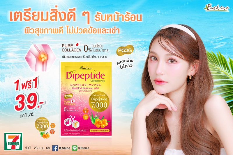 “บีไชน์ ไดเปปไทด์ คอลลาเจน พลัส” ซื้อ 1 ฟรี 1 ซอง เพียง 39 บาท หน้าร้อนนี้ผิวดี พร้อมข้อเข่าแข็งแรง ซื้อได้ที่เซเว่น อีเลฟเว่น