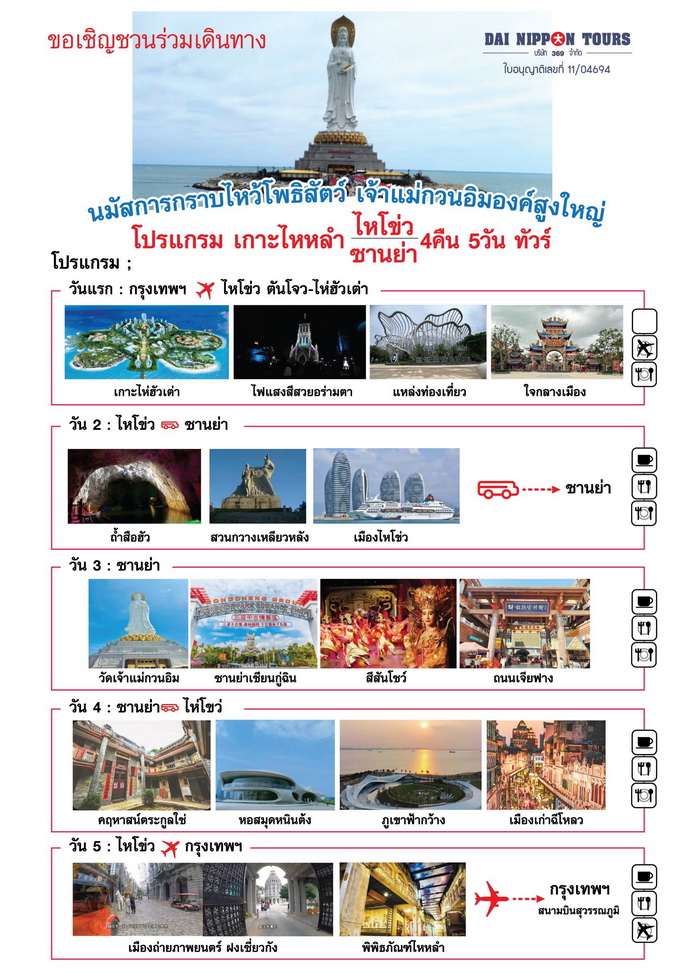 DAI NIPPON TOURS เปิดรับจัดทริปท่องเที่ยวเกาะไหหลำ ไหโข่ว–ชานย่า 4 คืน 5 วัน สัมผัสเส้นทางศรัทธาและการท่องเที่ยวระดับสากล