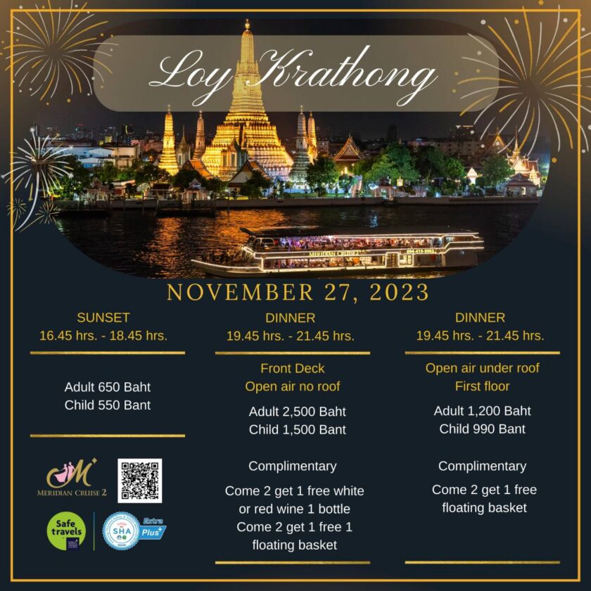 เมอริเดียน ครูซ ขอเชิญชวนทุกครอบครัวเข้าร่วมงานเทศกาลวันลอยกระทง สืบสานประเพณีวัฒนธรรมไทย ประจำปี 2566 “ วันจันทร์ที่ 27 พฤศจิกายน 2566 ” ร่วมล่องเรือรับประทานอาหารบุฟเฟต์นานาชาติ พร้อมรับชมวิวสองฝั่งแม่น้ำเจ้าพระยา ณ เรือเมอริเดียน ครูซ ไอคอนสยาม ทุกท่านสามารถเลือกรอบระหว่างรอบพระอาทิตย์ตกดินหรือรอบดินเนอร์ จัดเต็มกับเมนูมากมายไม่ว่าจะเป็นเมนูซีฟู้ด อาทิ กุ้งแม่น้ำย่าง หอยอบเนย แซลมอนซาชิมิ ซูชิหน้าต่างๆ และขนมหวานหลากหลายชนิด พานาคอตต้า เครมบรูเล่ และอีกมากมาย ฟรีเครื่องดื่มน้ำอัดลมตลอด 2 ชั่วโมง ตลอดการล่องเรือรับประทานอาหารทุกท่านจะได้รับฟังดนตรีสดแสนเพลิดเพลินจาก Live Band คลอไปด้วย เพียงเท่านี้ทุกท่านจะได้อิ่มกายอิ่มใจและประทับใจกับการบริการของเรือสำราญเมอริเดียน ครูซ ไม่รู้ลืม