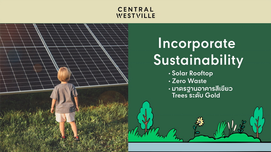 - SCG: ภายใต้คอนเซปต์ความเป็น Low Carbon Mall ของเซ็นทรัลพัฒนา ทาง SCG ในฐานะพันธมิตรที่มีเป้าหมายร่วมกันเพื่อมุ่งสู่สังคม Net Zero ได้ดำเนินการพัฒนาโครงการต้นแบบ Pathway to Net Zero Building อย่างเป็นรูปธรรม ด้วยการทำมาตรฐานอาคารเขียวในโครงการ Central Westville รวมถึงการคำนวณการลดการปลดปล่อยคาร์บอนเพื่อความยั่งยืนอย่างแท้จริง ทั้งยังนำเทคโนโลยีที่ช่วยประหยัดพลังงานพร้อมสร้างอากาศในอาคารให้สะอาดมาใช้งานเพื่อให้เป็นพื้นที่ที่ให้ความสำคัญต่อคุณภาพชีวิต