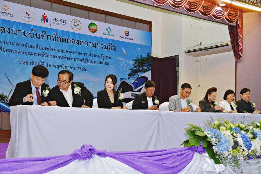 วันที่ 19 พฤศจิกายน 2566 เวลา 10.00 น.ณ.ห้องประชุมจอมพลป.พิบูลสงคราม ชั้น 5 กระทรวงแรงงาน สหภาพคนทำงานภาครัฐแห่งประเทศไทย โดยนายบุญรอด สนเปี่ยม ประธานสหภาพฯ ร่วมกับองค์กรพันธมิตรภาคเอกชน ได้แก่ บริษัทสตรอง (ไทยแลนด์) จำกัด, บริษัทรอยแลนด์ โฮลด์ดิ้งส์ จำกัด, บริษัทซันเวฟ โซลูชั่น จำกัด, บริษัทยูนิสตรอง จำกัด, บริษัทฟินเนเรียม จำกัด, บริษัทค้าเสียง จำกัด และสมาคมการค้านักธุรกิจสากล (สคส) จัดดำเนินการพิธีลงนามบันทึกข้อตกลงความร่วมมือโครงการ การขับเคลื่อนพลังงานสะอาดตามแนวนโยบายรัฐบาลเพื่อยกระดับคุณภาพชีวิตของคนทำงานภาครัฐในประเทศไทย