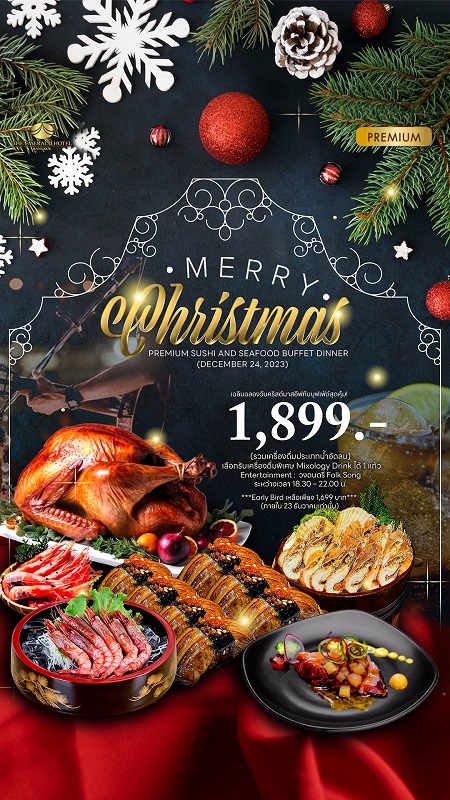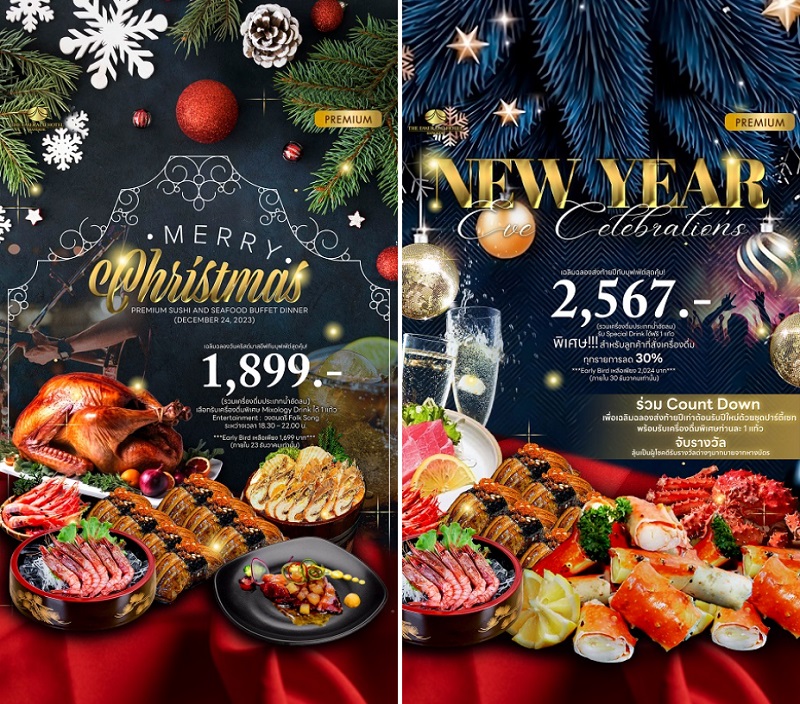 มาร่วมฉลองคริสต์มาสอีฟ ค่ำวันที่ 24 ธันวาคม 2566 ด้วย บุฟเฟต์นานาชาติรวมซูชิพรีเมียมและซีฟู้ด อาทิ หอยนางรม กั้งกระดาน ไก่งวง ซุปเห็ดทรัฟเฟิล กุ้งหวาน ซูชิฟัวกราส์ วากิว ฯลฯ เลือกรับเครื่องดื่มพิเศษ Mixology 1 แก้วและน้ำอัดลมไม่อั้น ฟังดนตรีจากวงโฟล์คซอง ผู้ใหญ่เพียงท่านละ 1,899 บาท เด็ก 950 บาท ระหว่างเวลา 18.00 – 22.00 น. ที่ดิเอมเมอรัลด์ ค็อฟฟี่ช็อพ โรงแรม ดิ เอมเมอรัลด์