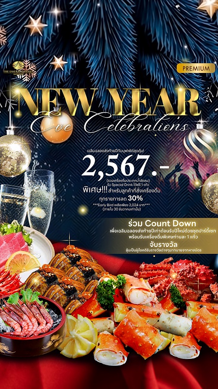 ขอเชิญท่านมาร่วมส่งท้ายปีเก่า ต้อนรับปีใหม่ ค่ำคืนวันที่ 31 ธันวาคม 2566 ที่ดิเอมเมอรัลด์ ค็อฟฟี่ช็อพ โรงแรม ดิ เอมเมอรัลด์ อิ่มอร่อยกับบุฟเฟต์นานาชาติรวมซูชิพรีเมียมและซีฟู้ด ที่ได้คัดสรรเมนูเพื่อมื้อค่ำสุดหรูของคุณ พร้อมเครื่องดื่มพิเศษให้เลือก 1 แก้วและน้ำอัดลมไม่อั้น เพลิดเพลินกับวงดนตรีเล่นสด เสริมบรรยากาศสนุกสุขสันต์ให้ทุกท่านได้ประทับใจ แล้วลุ้นรับรางวัลมากมาย ผู้ใหญ่ท่านละ 2,567 บาท เด็ก 1,280 บาท ช่วงนับเวลาถอยหลังเข้าสู่ปีใหม่ รับปาร์ตี้เซทและเครื่องดื่มพิเศษท่านละ 1 แก้ว