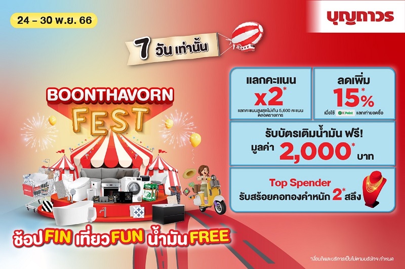 “Boonthavorn Fest” ช้อปFIN เที่ยวFUN น้ำมันFREE ดีลพิเศษส่งท้ายปี พบกับส่วนลดสินค้าสูงสุด 80% จากแบรนด์สินค้าตกแต่งบ้านชั้นนำจากทั่วโลก อาทิ กระเบื้อง สุขภัณฑ์อัตโนมัติ อุปกรณ์ห้องน้ำ เครื่องใช้ไฟฟ้าในครัว เครื่องทำน้ำอุ่น เครื่องทำน้ำร้อน อุปกรณ์ปิ้งย่าง เครื่องฟอกอากาศ โคมไฟตกแต่ง และเฟอร์นิเจอร์นำเข้าหลากสไตล์ พร้อมมอบสิทธิพิเศษสำหรับสมาชิกบุญถาวรแฟมิลี่ กับแลกคะแนน X2 , เชื่อมบัญชีผ่านไลน์แอด boonthavorn รับส่วนลดรวม 1,100 บาท , เลือกรับส่วนลดหรือบัตรของขวัญบุญถาวร สูงสุด 18,900 บาท , แลกคะแนน K Point เท่ายอดซื้อรับส่วนลด 15% เมื่อชำระเต็มจำนวน หรือ รับเครดิตเงินคืนสูงสุด 42,000 บาท จากบัตรเครดิตที่ร่วมรายการ เมื่อผ่อนชำระ , รับทันทีบัตรเติมน้ำมันมูลค่า 2,000 บาท เมื่อช้อปครบตามเงื่อนไข เฉพาะ 25-26 พฤศจิกายนนี้ และ Top Spender ที่สะสมยอดซื้อสูงสุดภายในงาน รับสร้อยคอทองคำหนัก 2 สลึง พิเศษ เพียงเชื่อมบัญชีไลน์ รับส่วนลดรวม 1,100 บาท สามารถกดรับส่วนลดผ่านไลน์แอด boonthavorn นอกจากนี้ หากลูกค้าไม่สะดวกมาช้อปที่สาขา สามารถช้อปผ่านออนไลน์รับส่วนลดเพิ่มสูงสุด 15%