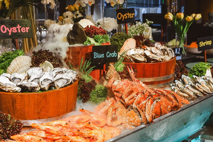 บุฟเฟต์นานาชาติรวมซีฟู้ดและซูชิพรีเมียมมื้อเย็น บริการระหว่างเวลา 18.00 – 22.00 น. เมนูไฮไลท์ที่ภูมิใจนำเสนอด้วยซีฟู้ดออนไอซ์ เช่น หอยนางรม ปูม้า หอยหวาน กุ้งแม่น้ำ หอยแมลงภู่นิวซีแลนด์ ฯลฯ พร้อมน้ำจิ้มสูตรเด็ดซี๊ดซ้าด รสแซบ สเต็กเนื้อออสเตรเลีย ขาหมูสูตรในตำนาน ข้าวต้มปลากะพง ซุปเห็ดทรัฟเฟิล ซูชิฟัวกราส์ วากิว ปลาไหลญี่ปุ่น กุ้งแม่น้ำเผา เทมปุระ เทปันยากิ มุม “ข้าวต้มกุ๊ย” บริการทั้งข้าวต้มแดง ข้าวต้มขาว ข้าวต้มข้าวกล้อง และเครื่องเคียงกับข้าวมากมายให้เลือกอิ่มอร่อย