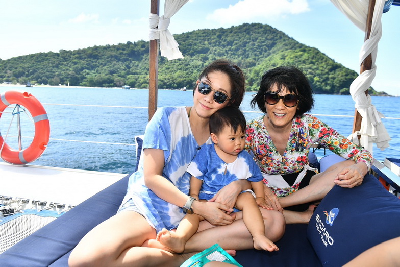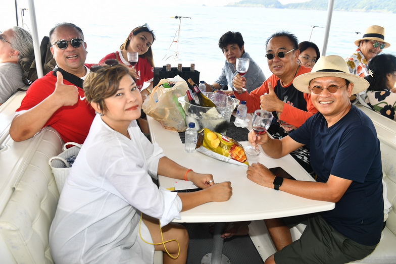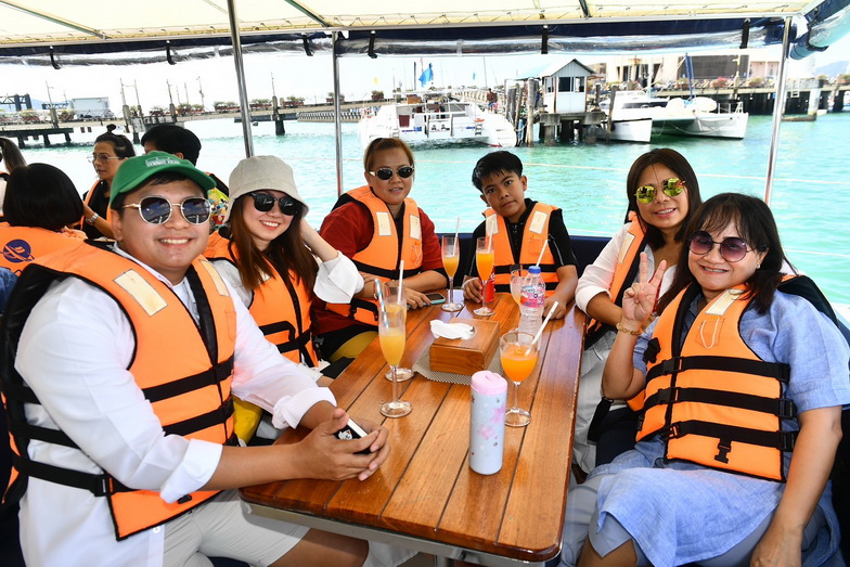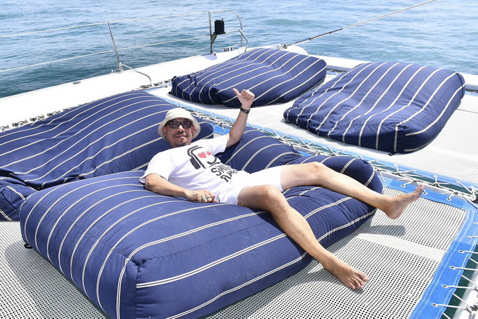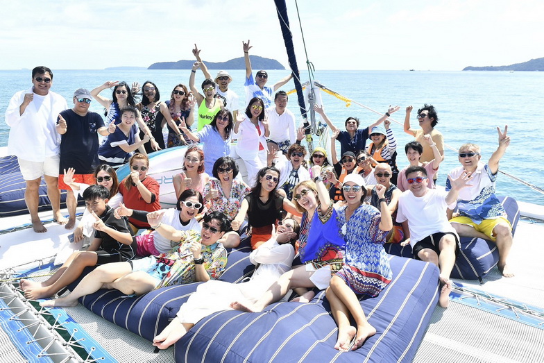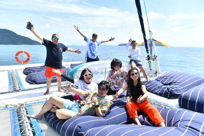 อาหารเช้าที่นี่เริ่ม 06.30 น. เป็นแบบ International เพราะลูกค้าส่วนใหญ่เป็นชาวต่างชาติ ก่อนนั่งรถตู้ชั่วโมงกว่าๆ ไปยังท่าเรืออ่าวฉลองเพื่อขึ้นเรือใบยอร์ช คาตามารัน (Catamaran) ที่มีที่นั่งตาข่ายสุดชิคและท้าทายด้านหน้า ถึงกระนั้นหลายคนชอบไปถ่ายรูปกันตลอด เราไปกัน 2 ลำโดยแบ่งผู้บริหาร ดีเจและแฟนพันธุ์แท้ของ Smile Radio ออกเป็น 2 กลุ่มใหญ่