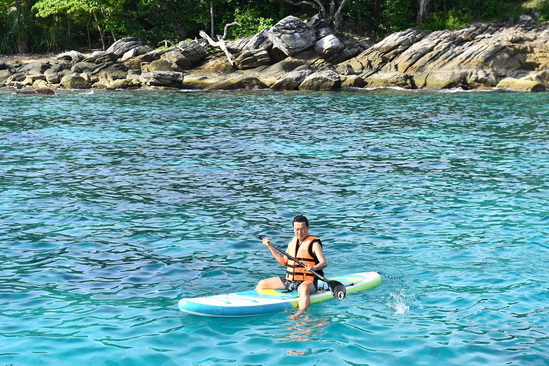 เสน่ห์ของเกาะเฮ คือน้ำทะเลใส หาดทรายขาว ปะการังสวย ที่ชาวต่างชาติมา Snorkelling ดูฝูงปลาเล็กปลาน้อย Sunbathe บนผ้าชิลๆ บนผืนทราย หรือ พายคายัก หรือเรือกล้วย ที่นี่เราเห็นชาวต่างชาติสนุกกับการเล่นพาราเซลลิ่งเพื่อชมความงามของเกาะจากท้องฟ้า