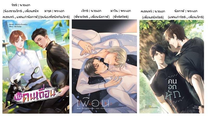 สำหรับนิยายที่ตัวละครเชื่อมโยงกันมีอยู่ด้วยกันสามเรื่องค่ะ เริ่มที่เรื่อง “จีบคนเถื่อน” , “เพื่อนไม่จริง” และ “คนอกหัก” ค่ะ ในการวางโครงเรื่องนิยายที่มีตัวละครเชื่อมโยงกันอันดับแรกน่าจะเริ่มมาจากความสัมพันธ์ค่ะ เป็นความสัมพันธ์ที่ซับซ้อน แต่ละตัวละครมีเรื่องราวในอดีตและปัจจุบันที่ซ้อนทับแล้วก็ทับซ้อนกันค่ะ มีความทรงจำที่ยากจะลืมกับเรื่องราวที่ติดค้างอยู่ในใจ เกิดเป็นปมที่ส่งผลให้แต่ละทุกตัวละครในเรื่องยังคงยึดติดอยู่กับอดีต จนไม่อาจก้าวข้ามผ่านช่วงเวลานั้นไปได้ แต่แล้วก็มีเหตุที่ทำให้ทุกคนได้กลับมาเคลียร์ใจกันจนเกิดเป็นเรื่องแยกของแต่ละคนออกมาค่ะ