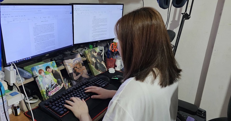“ปัจจุบันเขียนนิยายเป็นงานหลักค่ะ ตอนนี้เขียนนิยายมาประมาณหกปีแล้วค่ะ แต่ที่มาเขียนจริงจังเลยน่าจะแค่สี่ปี ก่อนหน้านี้เขียนนิยายเป็นเพียงงานอดิเรกค่ะ นามปากกาที่ใช้มีชื่อว่า “ตุ๊กตากระเบื้องเคลือบ” นิยายเรื่องแรกที่เขียนได้รับการตีพิมพ์กับทางสำนักพิมพ์ค่ะ เป็นการลงนิยายไว้ให้อ่านฟรีแล้วทางสำนักพิมพ์ก็ติดต่อมา เรื่องอื่น ๆ ก็เช่นเดียวกันค่ะ ส่วนใหญ่จะเป็นนิยายที่มีตัวละครเชื่อมโยงกัน หรือที่หลายคนเรียกว่าเป็นจักรวาลเดียวกันค่ะ