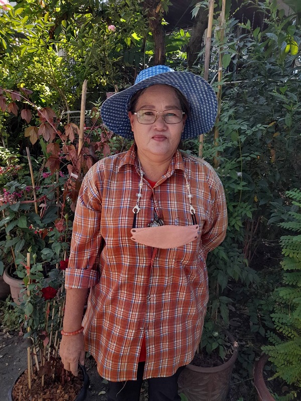 “ก่อนหน้าเย็บผ้าแต่พอตาไม่ดี และเป็นเส้นเลือดเลี้ยงหัวใจตีบ เคยมีกำลังเย็บผ้าอยู่แล้วเกิดชักจนตกเก้าอี้เย็บผ้าหลายหน สามีเลยให้เลิก แล้วน้อง ๆ เลยแนะนำให้ทำอาชีพขายต้นไม้ ก็เลือกต้นไม้สวย ๆ หลายชนิดใส่รถจากราชบุรีมาขับรถตระเวนขายในกรุงเทพฯ นอกจากขายต้นไม้แล้วขายกระถางจากโรงงานราชบุรี ลูกค้าเคยสั่งให้หากระถางใบใหญ่มากกก็ไปเอาที่โรงงานมาให้ได้กำไรนิดหน่อยแค่พออยู่ได้ และมีดินก้ามปูไม่ผสมขี้เถา, ดินขุยไผ่, มะพร้าวสับ, ปุ๋ยคอก, ปุ๋ยเม็ด, ปุ๋นอินทรีย์ แต่ถ้าลูกค้าต้องการต้นไม้ชนิดไหนก็เอาไปให้ตามออร์เดอร์ที่ลูกค้าสั่งก็มีค่ะ ถามว่าขายพวกต้นไม้พออยู่ได้มั้ยมันก็พออยู่ได้