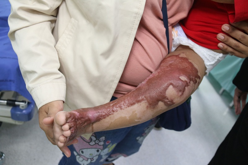 ทางด้าน นายแพทย์พินัย จิรฐิติวงศ์ แพทย์ผู้ชำนาญการด้านศัลยกรรมตกแต่ง ศูนย์ศัลยกรรมตกแต่ง โรงพยาบาลยันฮี กล่าวว่า ผู้ป่วยเด็กรายนี้มีประวัติ ถูกน้ำมันเดือดราดทั่วตัวมาประมาณ 5 ถึง 6 เดือนแล้ว จากการประเมินพบเป็นแผลน้ำมันลวกในระดับที่สอง ซึ่งมีโอกาสที่จะเกิดปัญหาได้ในอนาคต ปัจจุบันเริ่มมีแผลเป็นนูนบริเวณขาซ้ายและมือทั้งสองข้าง”
