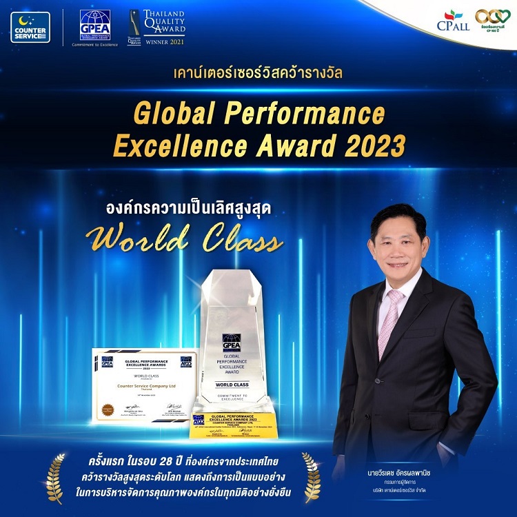 เคาน์เตอร์เซอร์วิส คว้ารางวัลระดับโลก Global Performance Excellence Award 2023 องค์กรความเป็นเลิศสูงสุดระดับ World Class
