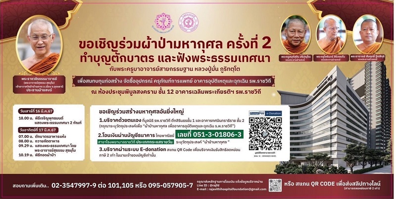 สามารถร่วมทำบุญ ด้วยการโอนผ่าน ธนาคารไทยพาณิชย์ 051-3-01806-3 สาขาโรงพยาบาลราชวิถี ประเภทกระแสรายวัน ระบุวัตถุประสงค์ “ผ้าป่ามหากุศล”
