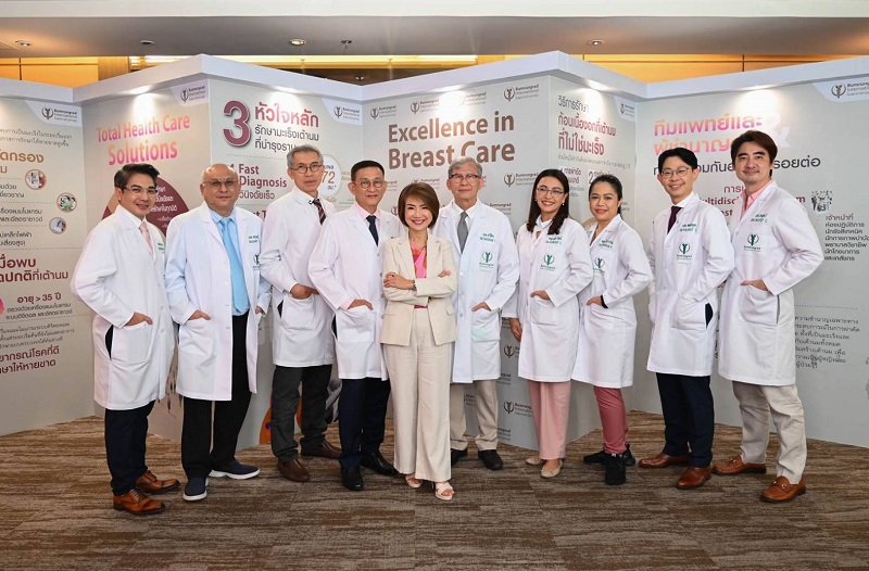 รศ. นพ. วิชัย วาสนสิริ หัวหน้าศูนย์เต้านม โรงพยาบาลบำรุงราษฎร์ กล่าวว่า ที่ศูนย์เต้านม โรงพยาบาลบำรุงราษฎร์ เราดูแลผู้ป่วยได้อย่างครบวงจรแบบองค์รวม โดยเราให้คำปรึกษา ตรวจวินิจฉัย และดูแลรักษาผู้ป่วยที่มีปัญหาเกี่ยวกับเต้านมในทุกมิติ เช่น มะเร็งเต้านม ก้อนที่เต้านม อาการเจ็บเต้านม พังผืดและถุงน้ำที่เต้านม ภาวะเต้านมอักเสบ และปัญหาอื่นๆ โดยมีการทำงานร่วมกันเป็นทีม ระหว่างทีมแพทย์ด้วยกันเองและทีมแพทย์กับสหสาขาวิชาชีพ ได้แก่ ศัลยแพทย์ด้านเต้านม, แพทย์รังสีวินิจฉัย, อายุรแพทย์ด้านโรคมะเร็ง, แพทย์รังสีรักษาและมะเร็งวิทยา, พยาธิแพทย์, เจ้าหน้าที่ห้องปฏิบัติการ, นักรังสีเทคนิค, นักกายภาพบำบัด, พยาบาลวิชาชีพ, นักโภชนาการและเภสัชกร ผ่านการประชุม Multidisciplinary Team Breast Conference เพื่อการรักษาที่ตรงจุด แม่นยำ เกิดผลข้างเคียงน้อย และให้ผลการรักษาที่ดีขึ้น โดย 3 หัวใจหลักของการรักษามะเร็งเต้านมที่บำรุงราษฎร์ คือ วินิจฉัยเร็ว (Fast Diagnosis), รักษาเร็ว (Fast Treatment) และผลลัพธ์การรักษาเป็นเลิศและมีความปลอดภัย (Excellent Outcome)