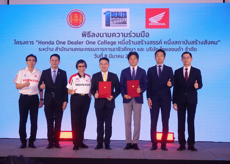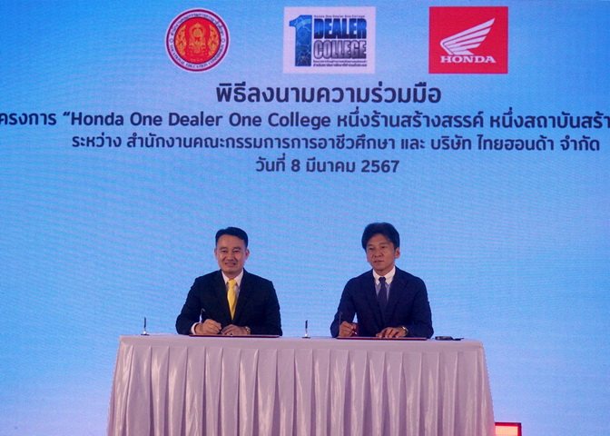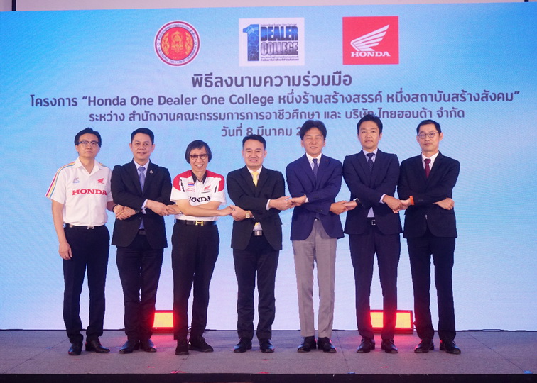 ไทยฮอนด้า ผู้ผลิตและจัดจำหน่ายรถจักรยานยนต์ และเครื่องยนต์อเนกประสงค์ฮอนด้าในประเทศไทย ร่วมมือกับ สํานักงานคณะกรรมการการอาชีวศึกษา (สอศ.) และร้านผู้จำหน่ายรถจักรยานยนต์ฮอนด้า ลงนามความร่วมมือในโครงการ ‘หนึ่งร้านสร้างสรรค์ หนึ่งสถาบันสร้างสังคม (One Dealer One College)’ เพื่อขับเคลื่อนการผลิตและพัฒนาบุคลากรอาชีวศึกษาที่มีคุณภาพ ให้สอดคล้องกับความต้องการของภาคอุตสาหกรรมยานยนต์ในปัจจุบัน พร้อมทั้งส่งเสริมและพัฒนาศักยภาพครู และบุคลากรทางการศึกษา ด้วยความรู้ ทักษะด้านยานยนต์และเครื่องยนต์อเนกประสงค์จากทางฮอนด้า เพื่อให้ทันต่อการเปลี่ยนแปลงของเทคโนโลยี และเป็นกำลังสำคัญในการส่งต่อความรู้ ทักษะ และวิชาการ ให้แก่สถานอาชีวะศึกษาทั่วประเทศไทย