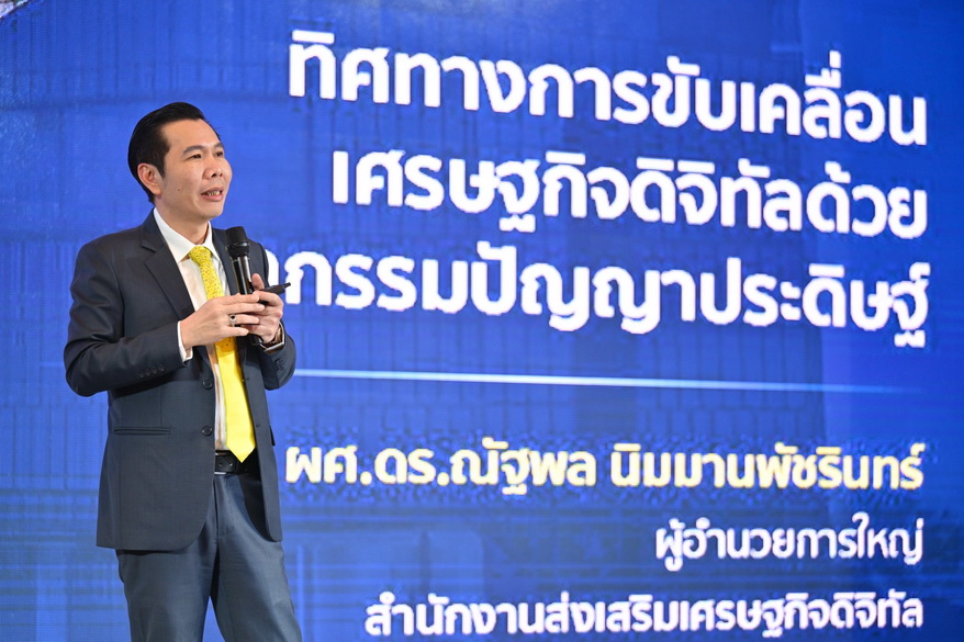 จากนั้น ผศ.ดร.ณัฐพล ยังได้บรรยายพิเศษในหัวข้อ ทิศทางการขับเคลื่อนเศรษฐกิจดิจิทัลด้วยนวัตกรรมปัญญาประดิษฐ์ โดยกล่าวว่า ปัจจุบันเทคโนโลยีและนวัตกรรมถือเป็นกลไกสำคัญในการขับเคลื่อนระบบเศรษฐกิจและสังคม ทำให้เกิดธุรกิจรูปแบบใหม่ อีกทั้งเปลี่ยนแปลงพฤติกรรมผู้บริโภคไปจากเดิม โดยเฉพาะอย่างยิ่งเทคโนโลยีปัญญาประดิษฐ์ (AI) ดังนั้นรัฐบาลต้องขับเคลื่อนองค์ประกอบสำคัญในการเตรียมความพร้อมด้านการพัฒนาเอไอ ประกอบด้วย AI Importer การเตรียมพร้อมรองรับการพัฒนาเอไอจากนอกประเทศ AI Provider การส่งเสริมการพัฒนาเอไอภายในประเทศ AI Distributor การประยุกต์ใช้เอไอเพื่อพัฒนาบริการดิจิทัล AI Manpower การเตรียมพร้อมกำลังคนดิจิทัลสาขาเอไอและ AI User การสร้างความตระหนักรู้ด้านการใช้เอไออย่างปลอดภัยแก่คนไทย นอกจากนี้ AI ยังส่งผลกระทบและสร้างความท้าทายต่อการคุ้มครองและส่งเสริมการใช้ประโยชน์จากทรัพย์สินทางปัญญาประเภทต่าง ๆ เช่น ลิขสิทธิ์ สิทธิบัตร เครื่องหมายการค้า ความลับทางการค้า ฯลฯ ซึ่ง กระทรวงดิจิทัลเพื่อเศรษฐกิจและสังคม โดย ดีป้า เล็งเห็นความสำคัญและดำเนินการส่งเสริมการจัดทำหรือยื่นจดทะเบียนทรัพย์สินทางปัญญาด้านดิจิทัลมาอย่างต่อเนื่อง ขณะเดียวกันยังมีการให้ความรู้ด้านเทคโนโลยี AI ซึ่ง ดีป้า หวังเป็นอย่างยิ่งว่า การดำเนินงานต่าง ๆ จะช่วยรักษาและปกป้องทรัพย์สินทางปัญญา ขับเคลื่อนเศรษฐกิจและสังคมในยุคดิจิทัล เพิ่มขีดความสามารถทางการแข่งขันแก่ผู้ประกอบการไทยเพื่อก้าวสู่ระดับสากล