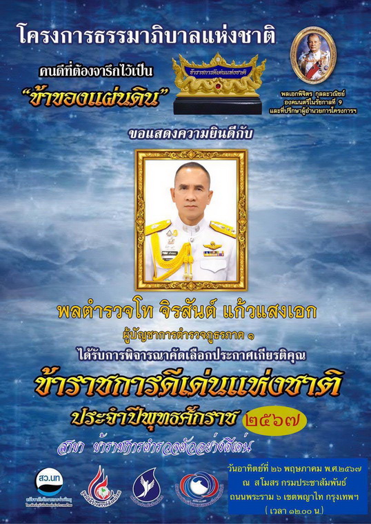 พลตำรวจโท จิรสันต์ แก้วแสงเอก ผู้บัญชาการตำรวจภูธรภาค 1 ได้รับรางวัล ข้าราชการดีเด่นแห่งชาติ ประจำปีพุทธศักราช 2567 สาขา ข้าราชการตำรวจตัวอย่างดีเด่น