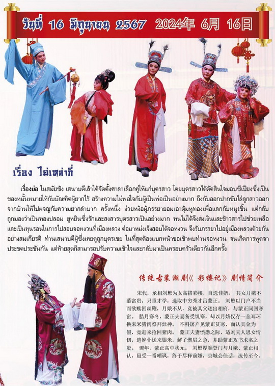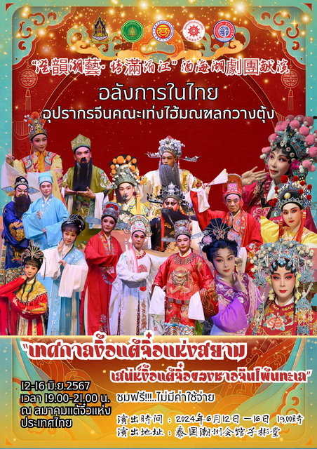จึงใคร่ขอเรียนเชิญประชาชนที่สนใจเข้าร่วมชมการแสดงงิ้วแต้จิ๋วชุดพิเศษ ระหว่างวันที่ 12 – 16 มิถุนายน 2567 ตั้งแต่เวลา 19.00 น. – 21.00 น. จัดการแสดง 5 ตอน วันละ 1 รอบ ณ สมาคมแต้จิ๋วแห่งประเทศไทยโดยเปิดให้ชมฟรี ไม่มีค่าใช้จ่าย ตลอดทั้ง 5 วัน