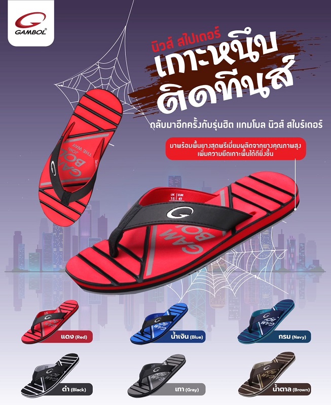 ฤดูฝนนี้ GAMBOL ออกสินค้ารองเท้าแตะ หนีความจำเจแบบเดิมๆ ด้วย รุ่น นิวส์ สไปเดอร์ ที่ได้รับแรงบันดาลใจจากใยแมงมุมมาตกแต่งที่พื้นรองเท้า เพิ่มความโดดเด่น สีสันสดใส ตามสไตล์ GAMBOL พร้อมฟังก์ชั่นการยึดเกาะพื้นได้ดี และความนุ่ม ทน เบา สบาย