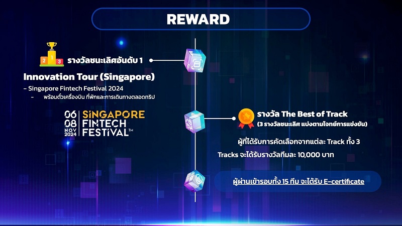 ทีมที่ชนะเลิศจะได้รับโอกาสพิเศษในการเข้าร่วมงาน Singapore Fintech Festival ซึ่งจะจัดขึ้นระหว่างวันที่ 6 – 8 พฤศจิกายน 2567 ที่ประเทศสิงคโปร์ ซึ่งเป็นงานระดับโลกที่รวบรวมผู้เชี่ยวชาญด้าน Fintech นักลงทุน และผู้นำทางเทคโนโลยีจากทั่วโลก โดย NITMX จะเป็นผู้สนับสนุนตั๋วเครื่องบินไปกลับ ที่พัก รวมถึงค่าอาหารให้กับผู้ที่ได้รับรางวัลชนะเลิศ งานนี้จะเปิดโอกาสให้ผู้เข้าร่วมสามารถสร้างเครือข่ายและนำเสนอนวัตกรรมของตนต่อผู้เชี่ยวชาญระดับสากล นอกจากนี้ ทีมที่ชนะเลิศในแต่ละด้านยังจะได้รับรางวัล “The Best of Track” พร้อมเงินรางวัล 10,000 บาทต่อด้าน ซึ่งจะเป็นการยกย่องความสามารถในแต่ละสาขาของผู้เข้าแข่งขันอีกด้วย
