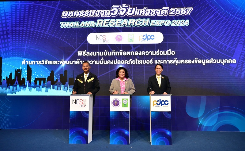 วันที่ 27 สิงหาคม 2565 สำนักงานการวิจัยแห่งชาติ (วช.) กระทรวงการอุดมศึกษา วิทยาศาสตร์ วิจัยและนวัตกรรม ลงนามบันทึกข้อตกลงความร่วมมือด้านการวิจัยและพัฒนา เพื่อเสริมสร้างความมั่นคงปลอดภัยทางไซเบอร์และการคุ้มครองข้อมูลส่วนบุคคลในประเทศไทย ร่วมกับ สำนักงานคณะกรรมการการรักษาความมั่นคงปลอดภัยไซเบอร์แห่งชาติ (สกมช.) และสำนักงานคณะกรรมการคุ้มครองข้อมูลส่วนบุคคล (สคส.) ในการนี้ ดร.วิภารัตน์ ดีอ่อง ผู้อำนวยการสำนักงานการวิจัยแห่งชาติ กล่าวต้อนรับและกล่าวถึงความเป็นมาของความร่วมมือในครั้งนี้ ซึ่งได้รับเกียรติจาก พลอากาศตรีอมร ชมเชย เลขาธิการคณะกรรมการการรักษาความมั่นคงปลอดภัยไซเบอร์แห่งชาติ พร้อมด้วย ดร.ศิวรักษ์ ศิวโมกษธรรม เลขาธิการคณะกรรมการคุ้มครองข้อมูลส่วนบุคคล กล่าวถึงจุดมุ่งหมายของความร่วมมือดังกล่าว เพื่อสนับสนุนการวิจัยและพัฒนาด้านความมั่นคงปลอดภัยทางไซเบอร์และการคุ้มครองข้อมูลส่วนบุคคล โดยมี นางมาริยาท ตั้งมิตรเจริญ ผู้อำนวยการกองระบบและบริหารข้อมูล เชิงยุทธศาสตร์ ด้านวิทยาศาสตร์ วิจัยและนวัตกรรม และ ผศ.ดร.วราภรณ์ พรหมวิกร ผู้ช่วยเลขาธิการคณะกรรมการการรักษาความมั่นคงปลอดภัยไซเบอร์แห่งชาติ นายนิเวช มิ่งมิตรโอฬาร ผู้อำนวยการสำนักเทคโนโลยีสารสนเทศ ร่วมเป็นสักขีพยานการลงนามในครั้งนี้ ในงาน “มหกรรมงานวิจัยแห่งชาติ 2567” (Thailand Research Expo 2024) ภายใต้แนวคิด “สานพลังวิจัย ขับเคลื่อนเศรษฐกิจและสังคมไทยอย่างยั่งยืน” ณ เวที Highlight Stage ห้องบางกอกคอนเวนชันเซ็นเตอร์ ชั้น 22 โรงแรมเซ็นทาราแกรนด์ และบางกอกคอนเวนชันเซ็นเตอร์ เซ็นทรัลเวิลด์ กรุงเทพฯ