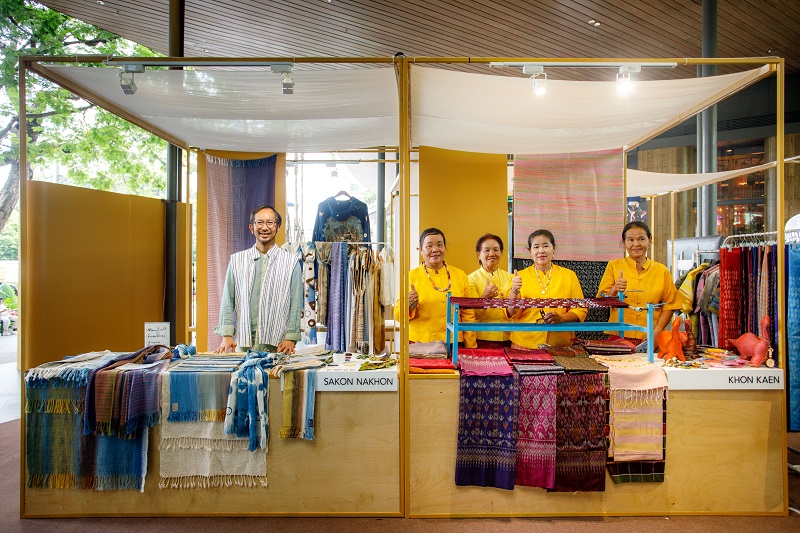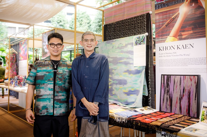 3. จังหวัดขอนแก่น (แดนมัดหมี่) จัดแสดงภายใต้แนวคิด “Circular Phuvieng” ผ้ามัดหมี่ร่วมสมัยจากแนวคิดเศรษฐกิจหมุนเวียน ซึ่งจังหวัดขอนแก่นสามารถลดการนำเข้าวัตถุดิบใหม่ และหันมาใช้ทรัพยากรที่มีอยู่แล้วให้เกิดประโยชน์สูงสุด เศษเส้นไหมมากมายจากการทอผ้าถุงถูกนำมาออกแบบเทคนิคการทอใหม่ เกิดเป็นลายใหม่ที่แลดูคล้ายการทับซ้อนของชั้นหินฟอสซิลในอุทยานธรณีภูเวียง ประสานกับการจับคู่สีทำให้ดูร่วมสมัย เกิดเป็นผืนผ้าที่นำไปต่อยอดเป็นสินค้าอื่นๆ ได้อีกมากมาย