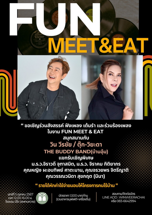 วิน วีรชัย เจ้าพ่อนักเอนเตอร์เทน ลุกขึ้นมาชวนสนุกสังสรรค์ ร่วมร้องเพลงเต้นรำพร้อมๆ กับทำกุศล ในงาน Fun meet&eat เสาร์ที่ 5 ตุลาคมนี้ ที่โรงแรมมิโด้ สะพานควาย